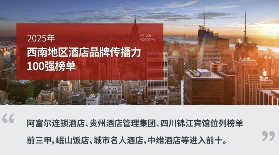 年度百强榜单迈点研究院发布“2025年西南地区酒店品牌传播力100强榜单”,阿富尔连锁酒店、贵州酒店管理集团、四川锦江宾馆居前三。榜单竞争格局多样,国内高端酒店如贵州酒···